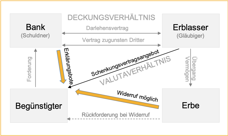 Anspruche 4 Erbfall Was Nun from nachlassabwicklung24.de A, ein unternehmen mit einer großen fabrik, schließt einen vertrag mit einem unternehmen, das die lokale kanalisation betreibt. Hiernach erwirbt der dritte in diesem fall unmittelbar das recht, die leistung zu fordern. (2) in ermangelung einer besonderen bestimmung ist aus den umständen, insbesondere aus dem zwecke des vertrags, zu entnehmen, ob der dritte das recht erwerben. 1 bgb), als auch als unechte oder lediglich verpflichtende. Sie könnten ihn sogar widerrufen lassen, sodass der dritte leer ausgeht. Vertrag zugunsten dritter mit späterem gläubigerwechsel: An einem vertrag zugunsten dritter auf den todesfall sind in aller regel drei personen beteiligt. Allerdings wird der formmangel geheilt, wenn die schenkung vollzogen ist.